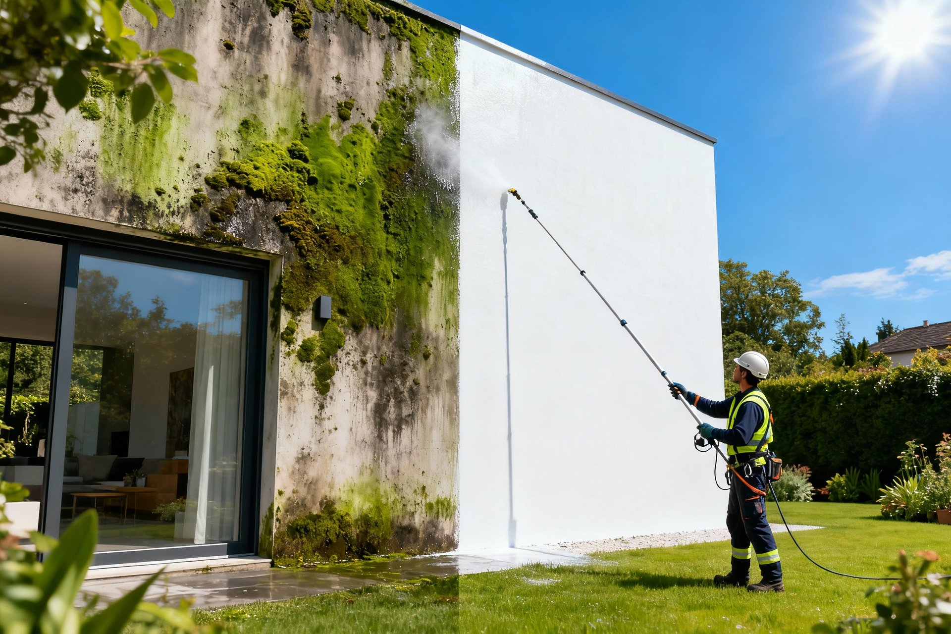 Twój dom pokrył się zielonym nalotem? To nie tylko kwestia estetyki – glony i grzyby niszczą tynk. Myjemy elewacje metodą niskociśnieniową (SoftWash) lub gorącowodną, bezpieczną dla styropianu.